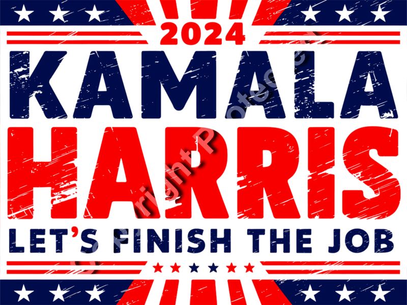 Kamala Harris 2024 campaign poster with bold red and blue lettering stars and patriotic theme