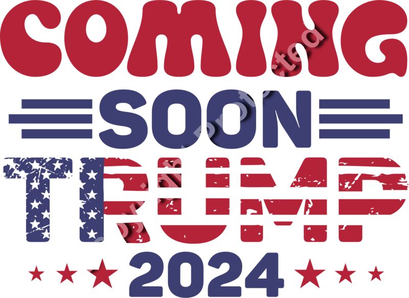Trump 2024 coming soon patriotic graphic with stars and stripes design