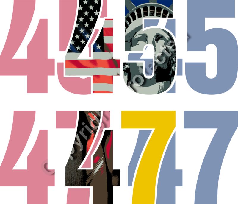 Trump 2024 election themed graphic with numbers American flag Statue of Liberty and ties